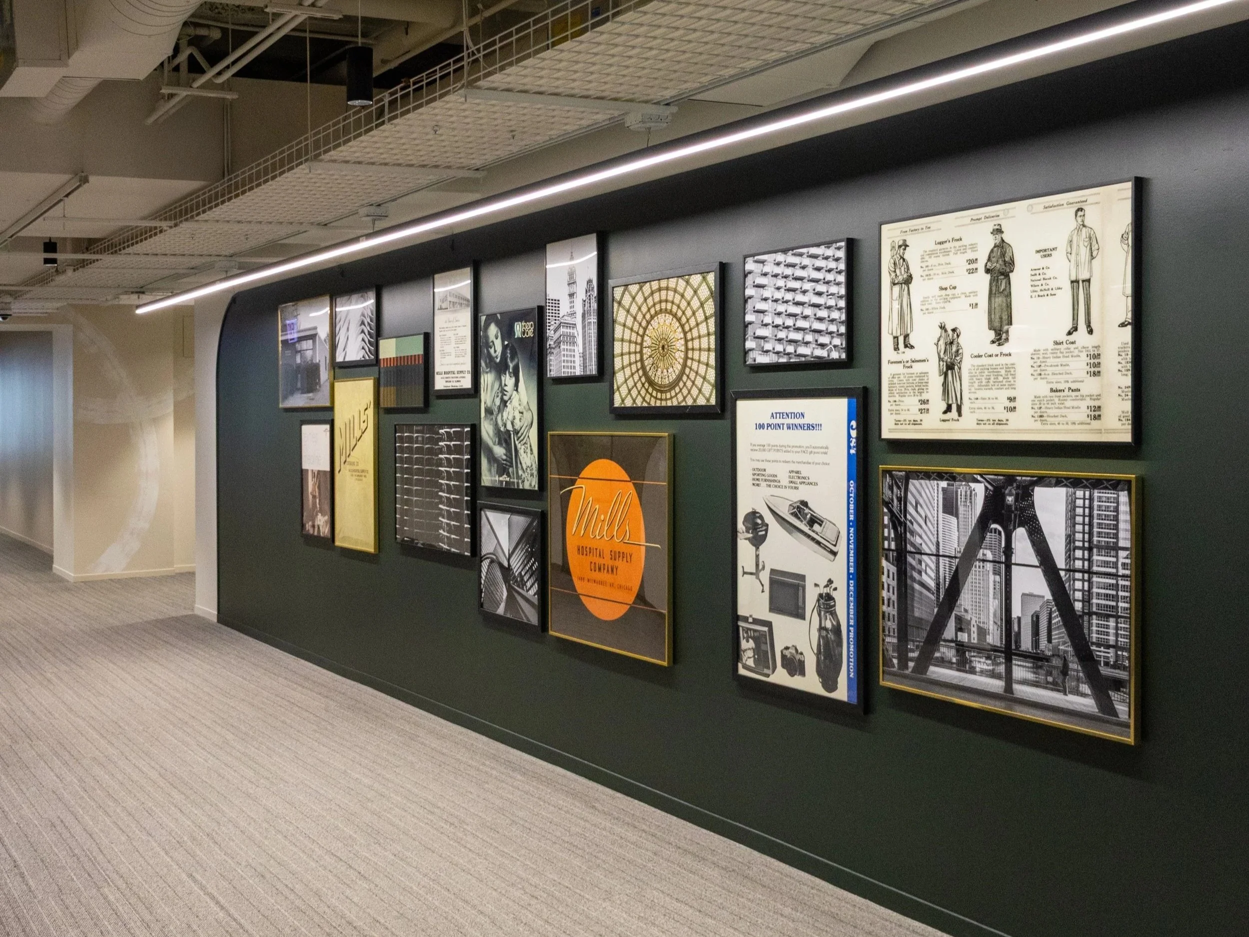 Staging for Medline’s downtown office blends warmth, history, and brand storytelling. Lush greenery, curated books, and layered décor create a comfortable, lived-in balance within the modern workspace. Gallery walls celebrate Medline’s legacy through vintage advertisements, archival photography, and subtle nods to Chicago, while company artifacts, including books and awards, are woven naturally into the composition.