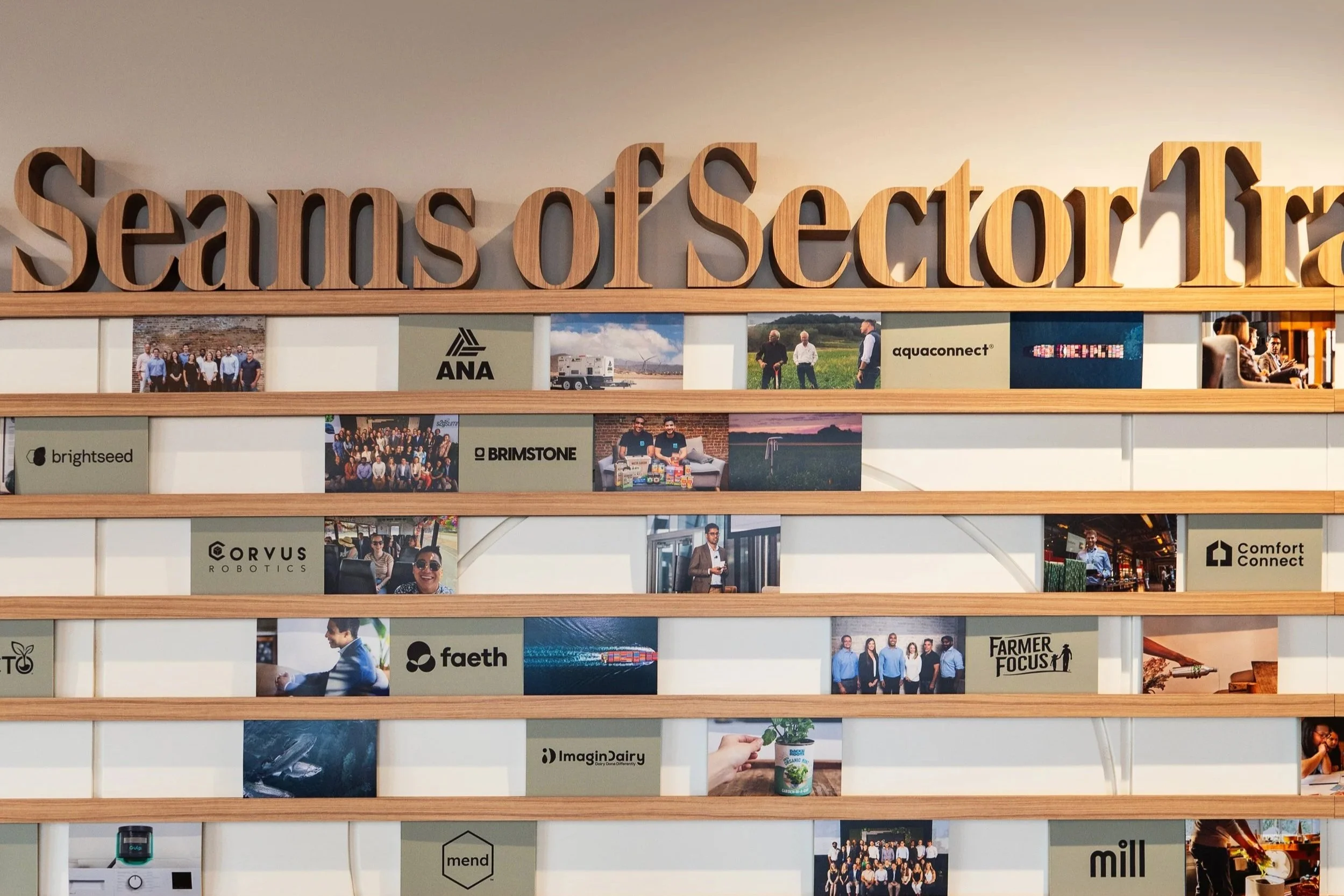 A custom millwork photo rail installation celebrates S2G’s partnerships with partner logo cards and 4x6 photo prints, allowing for seamless updates as the organization grows. Wood tones match other finishes throughout the space, and the subtle brand shape linework backer ties into other elements throughout the office.