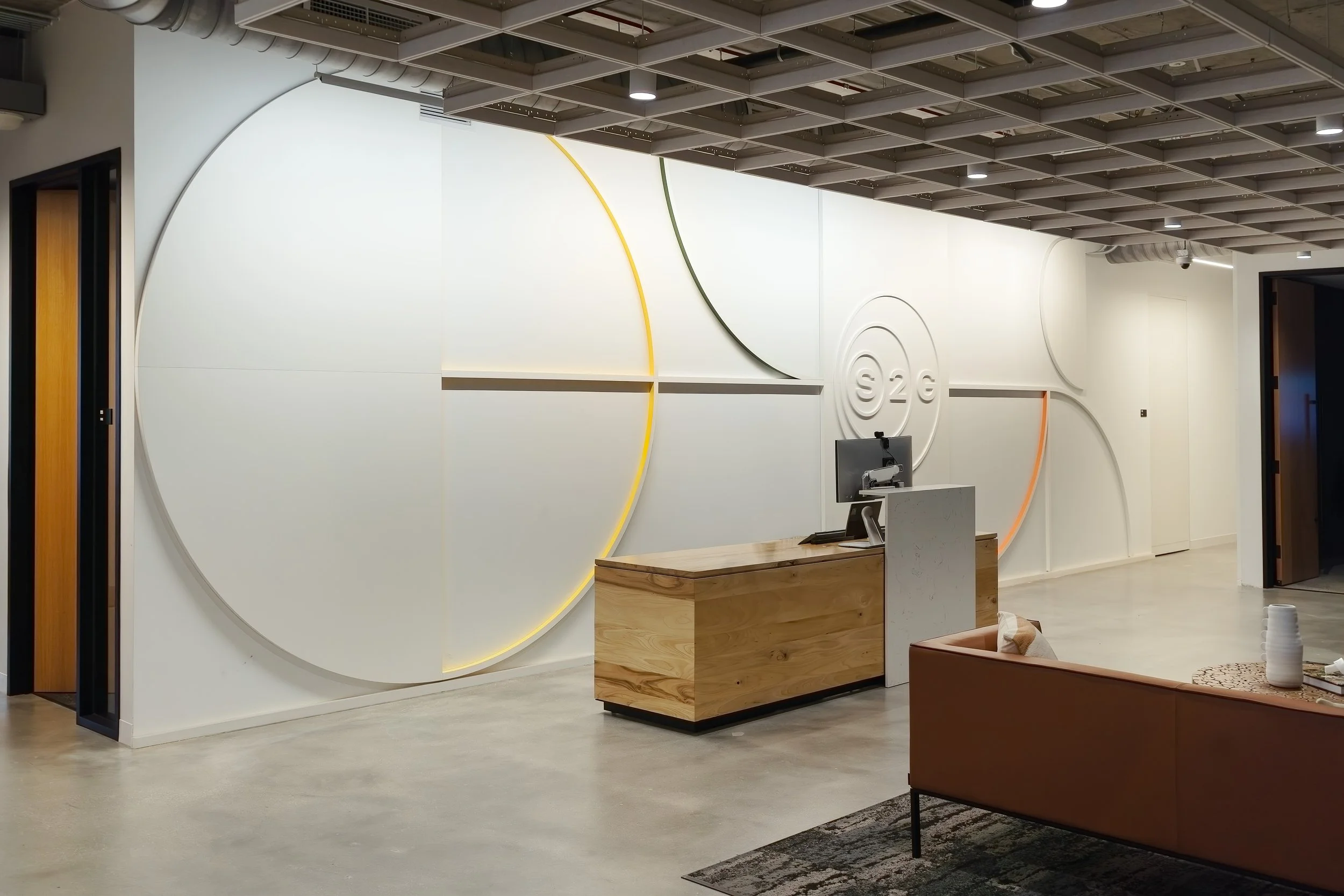 Oversized, tone-on-tone brand shapes compliment a dimensional S2G logo and welcome employees and visitors into the workplace. The design continues down the adjacent corridor and hints of the brand palette are revealed on the returns of the dimensional shapes.