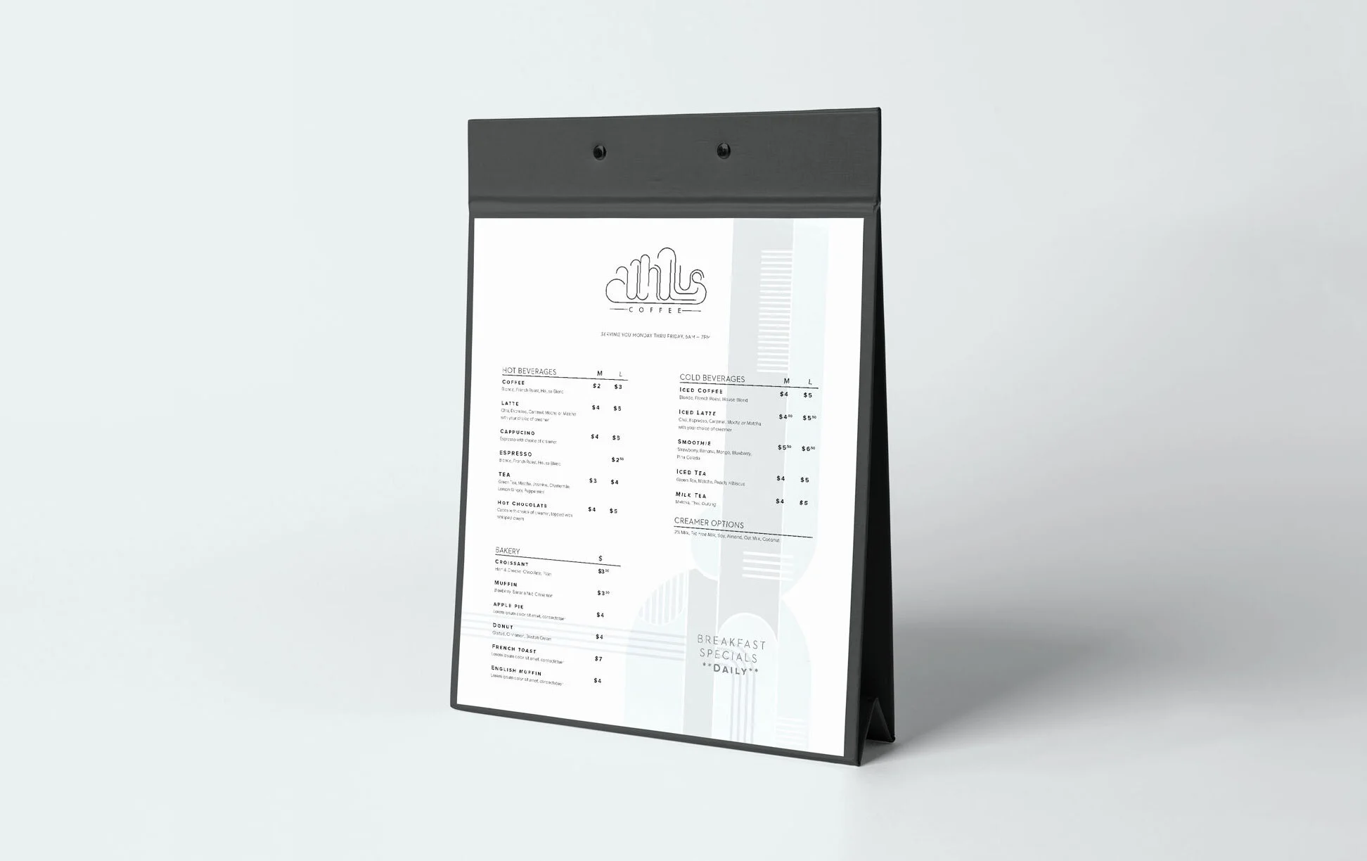 Logo design for Cumulus Coffee, a new café concept in a cloud-based tech company. The logo is used on interior signage and mockups for menu design and packaging.