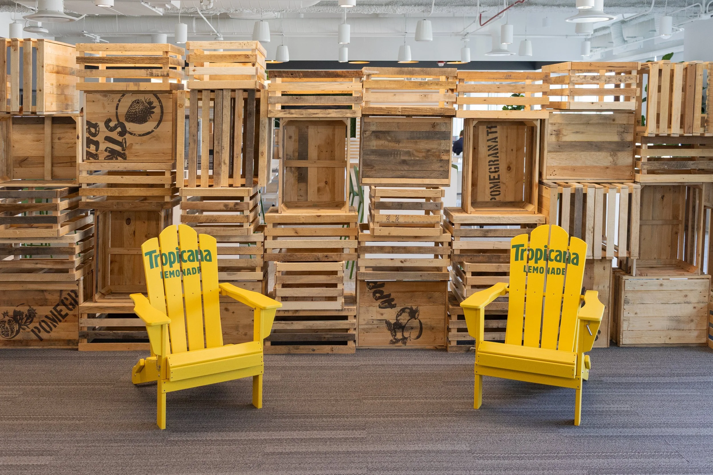 Printed fruit crates from TBG’s previous space get a second life as a partition between the cafe and workstations. Faux trees flank either side of the installation, emphasizing the natural, tropical feel of the element that nods to Tropicana’s Florida roots.